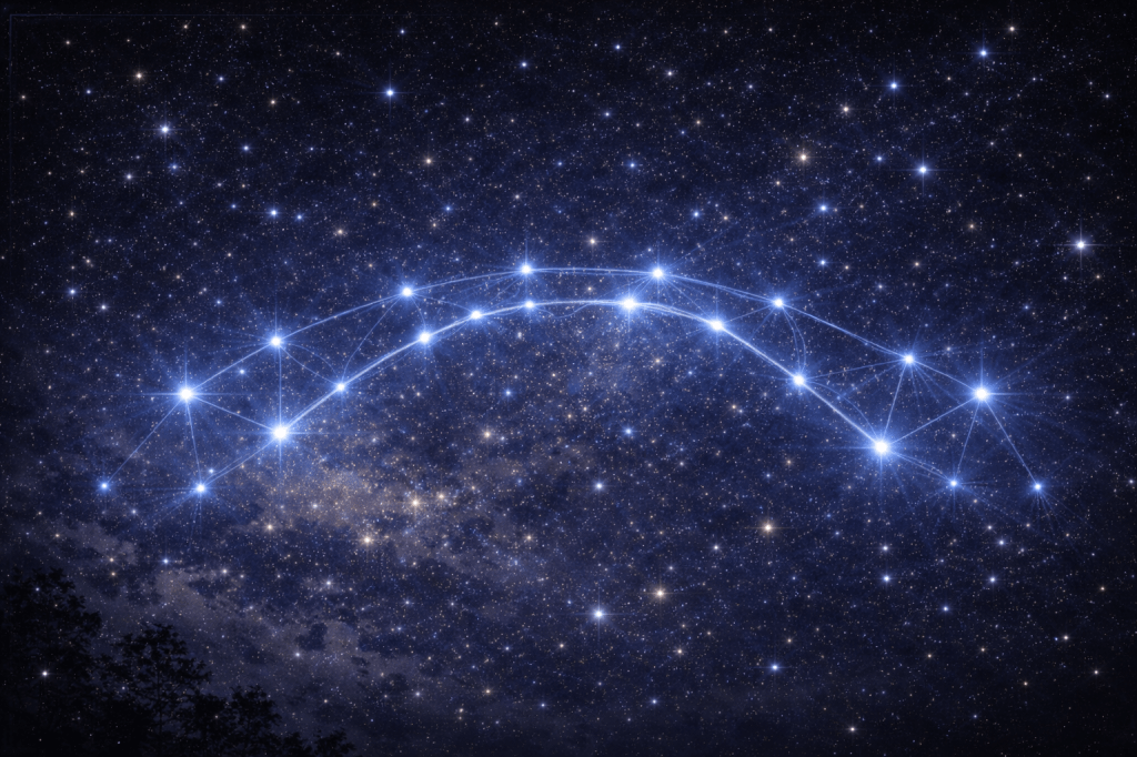 Sus estrellas forman un arco luminoso que recuerda a un puente suspendido en el cielo nocturno.