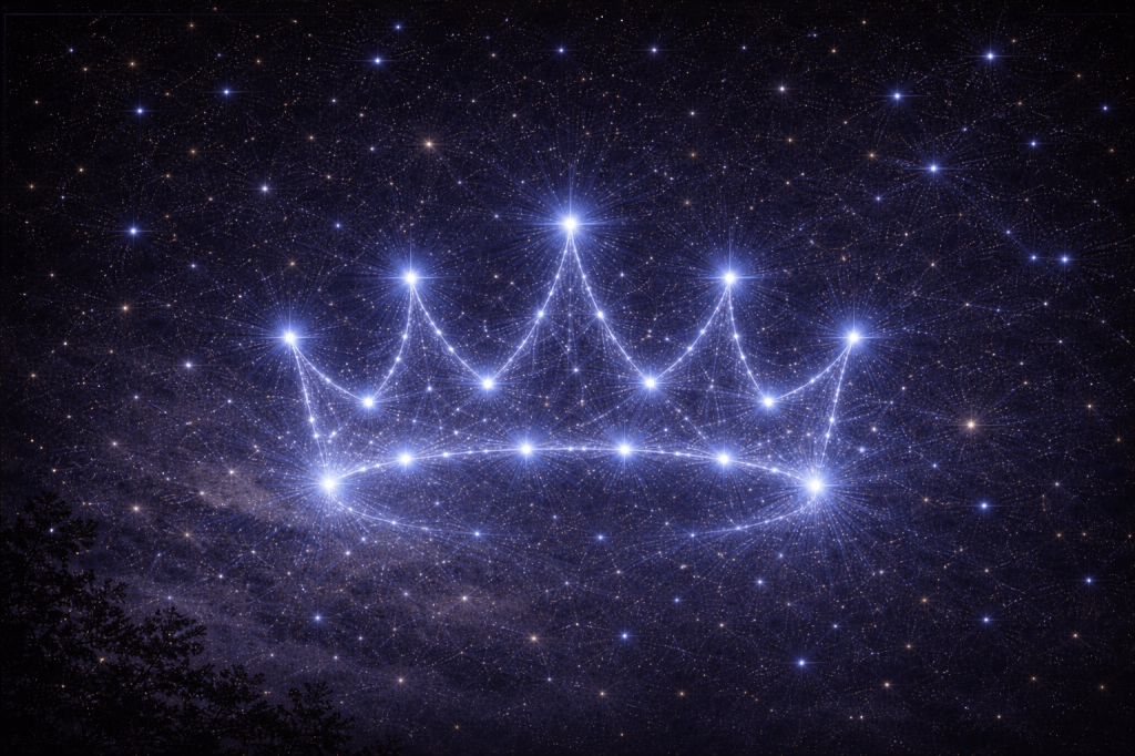 Alta y tenue en el firmamento del observatorio aparece una constelación circular formada por pequeñas estrellas.