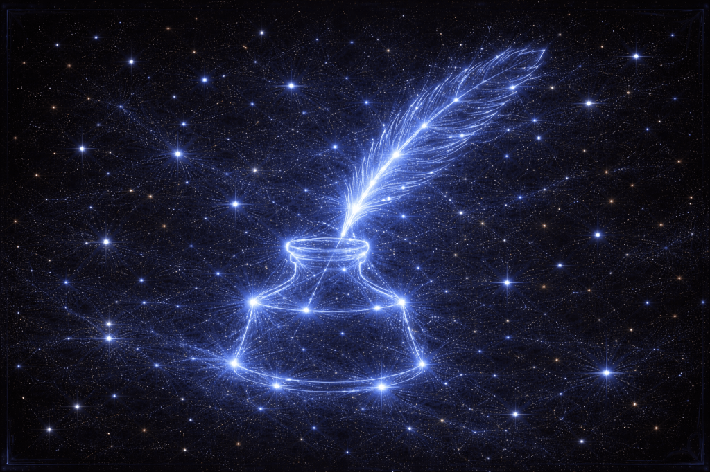 Entre las formaciones del cielo narrativo existe una constelación que los observadores del monasterio consideran una de las más inspiradoras. Sus estrellas parecen dibujar la silueta de un pequeño frasco de tinta del cual surge una pluma luminosa, como si la escritura misma naciera desde el cielo.
