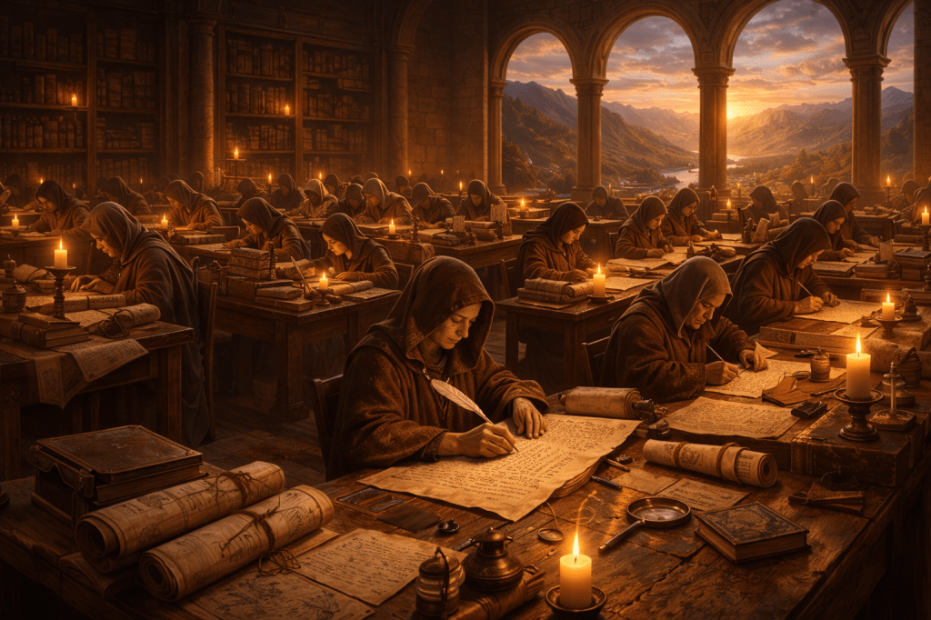 En el scriptorium del monasterio se utilizan las herramientas más simples que conoce el oficio: pluma, tinta y papel.