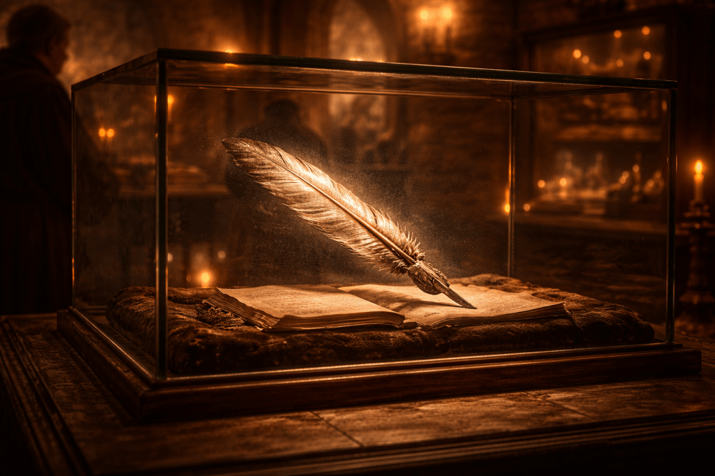 En esta sala se guarda una de las plumas más antiguas del Monasterio.